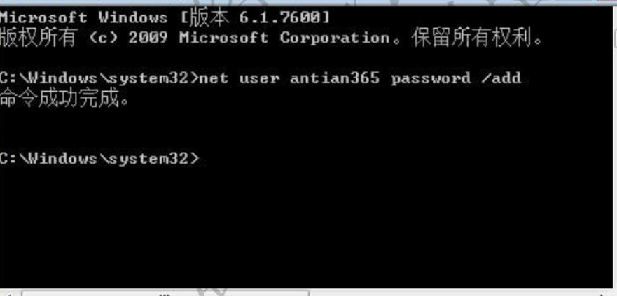 (4)在Windows7中新增一个用户antian365,密码为pasword。在单击“开始”-“运行”中输入“cmd”并按“Shift+Ctrl+Enter”组合键,输入命令“netuserantian365pssord/add”。或者以管理员权限启动“cmd.exe”程序也可,执行成功后如图1所示。测试完毕后可以通过命令删除该帐号“netuserantian365/del”。
